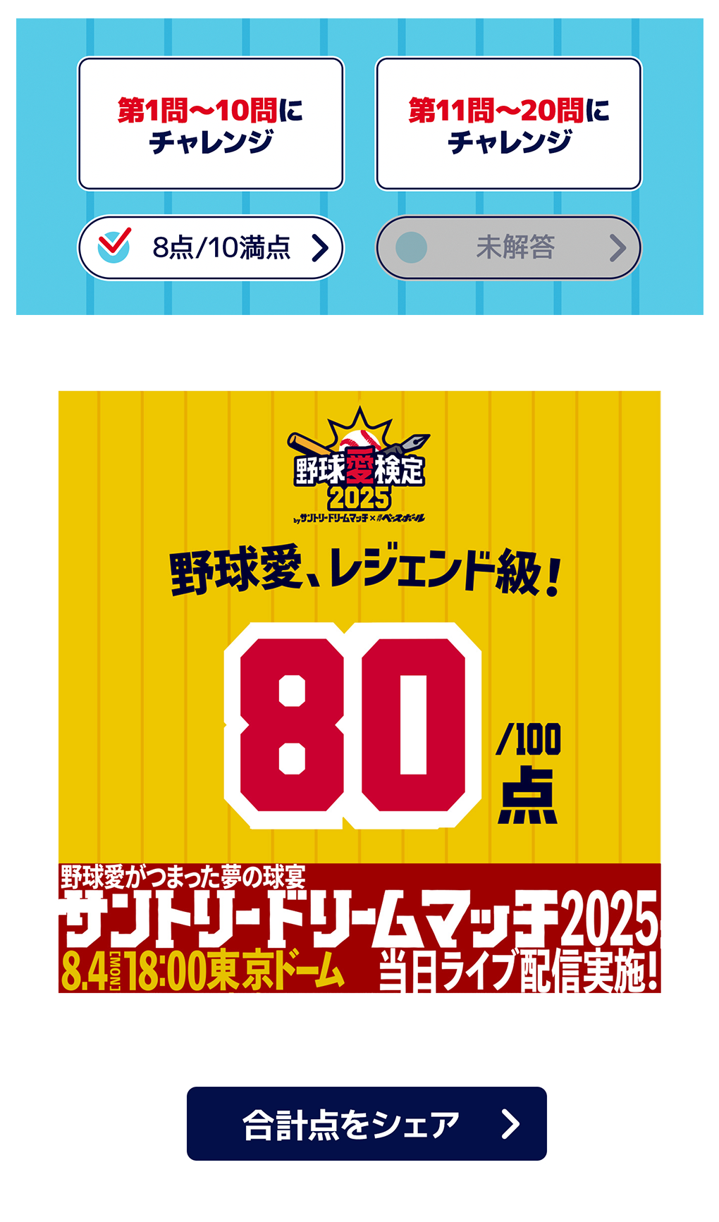 野球愛検定のトップページの以下箇所から、各回の結果や、検定の合計点をご確認いただけます。